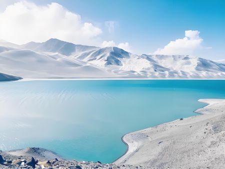 班迪爾藍(lán)湖,也被稱為下坂地水庫(kù)、坎兒洋龍池。地處帕米爾高原的塔什庫(kù)爾干縣班迪爾鄉(xiāng),海拔約3050米。水域面積約為3平方公里。水深:約為30米。班迪爾藍(lán)湖的湖水呈現(xiàn)出深邃的藍(lán)色,這是由于湖水中含有高濃度的礦物質(zhì)。湖泊周圍是昆侖山脈的裸露巖層,與湖泊的藍(lán)色形成了鮮明的對(duì)比,給人一種冰冷而深邃的美感。游客